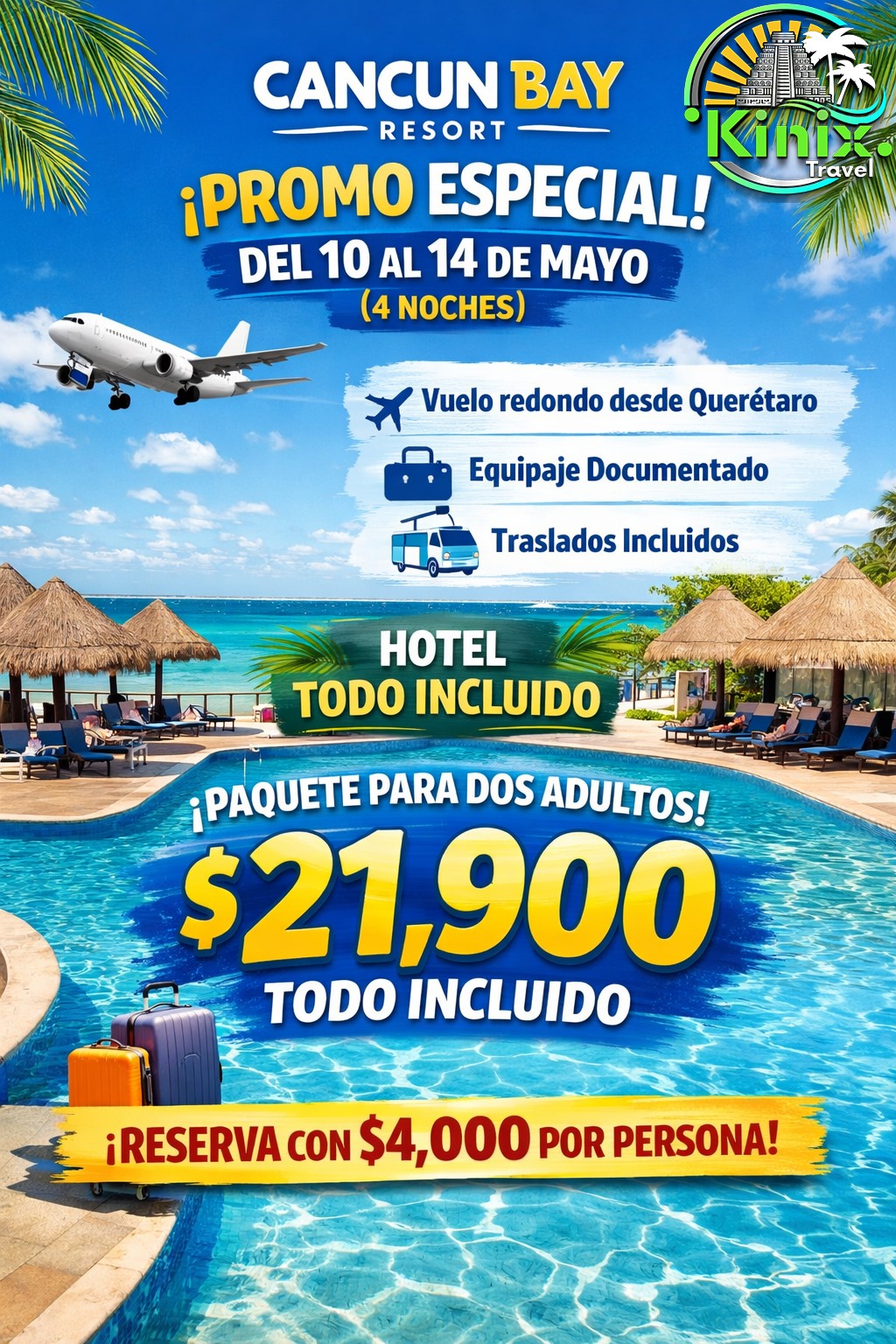 Cancún te está esperando… y esta es tu señal para reservar. Disfruta 4 noches en el increíble Cancún Bay Resort del 10 al 14 de mayo con un paquete completo, sin preocupaciones y al mejor precio.