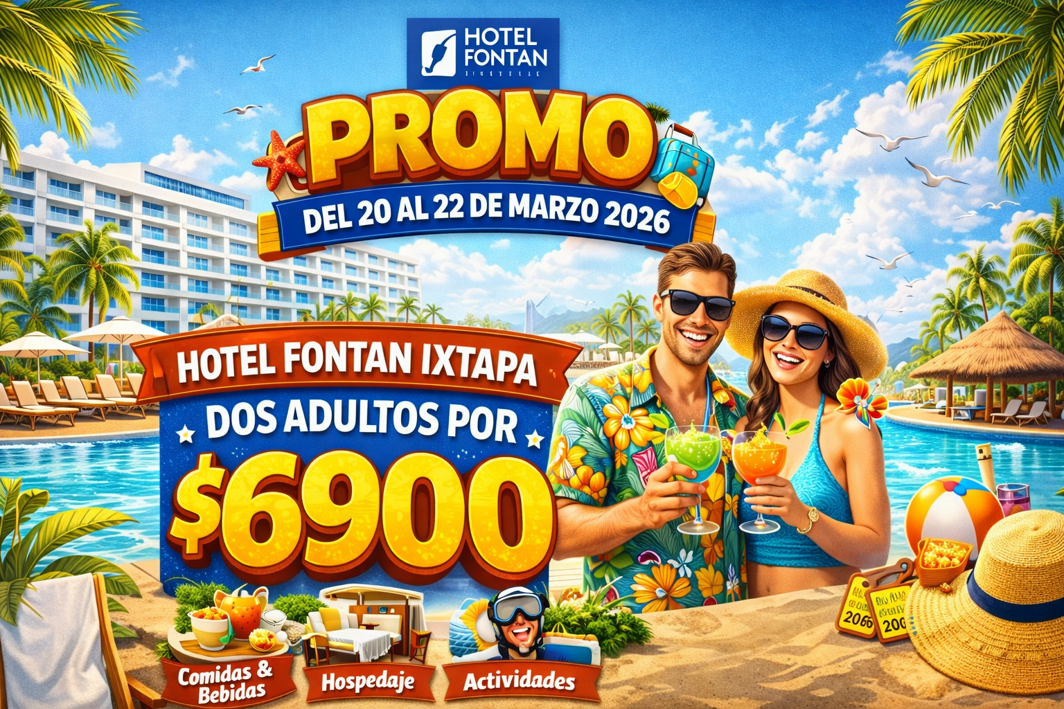 Si estás buscando una escapada a la playa, el Hotel Fontan Ixtapa del 20 al 22 de marzo 2026 puede ser la opción perfecta para tus próximas vacaciones. Aprovecha esta promoción y disfruta de unos días increíbles frente al mar en uno de los destinos más bonitos del Pacífico mexicano.