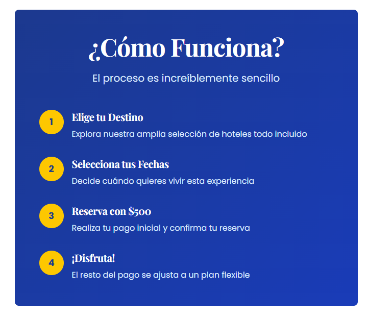 Sabemos que planificar unas vacaciones puede parecer una inversión grande. Por eso ofrecemos la oportunidad de asegurar tu lugar en el paraíso con una inversión mínima.